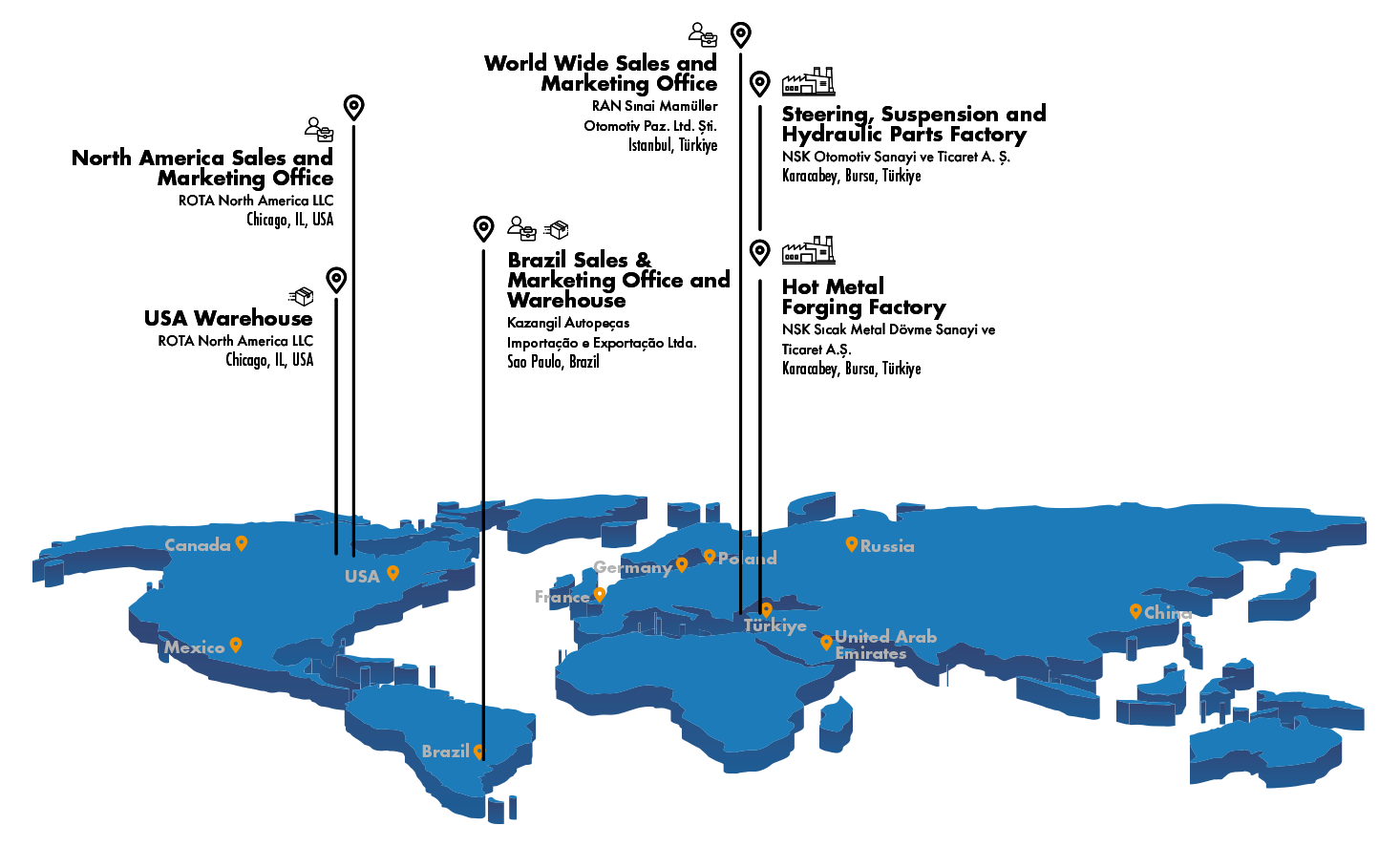 Fabricamos piezas de dirección, suspensión, hidráulicas y forjadas para vehículos comerciales, vehículos agrícolas, maquinaria de construcción y algunos otros sectores bajo la marca ROTA. Tenemos dos fábricas ubicadas en Bursa (Turquía), así como oficinas de ventas y marketing en Estambul (Turquía), Chicago (EE. UU.) y almacenes en São Paulo (Brasil) y Chicago (EE. UU.). Operamos en todo el mundo con la visión de convertirnos en una empresa orientada al cliente, líder en el mercado y una marca global que sea la primera en pensar.