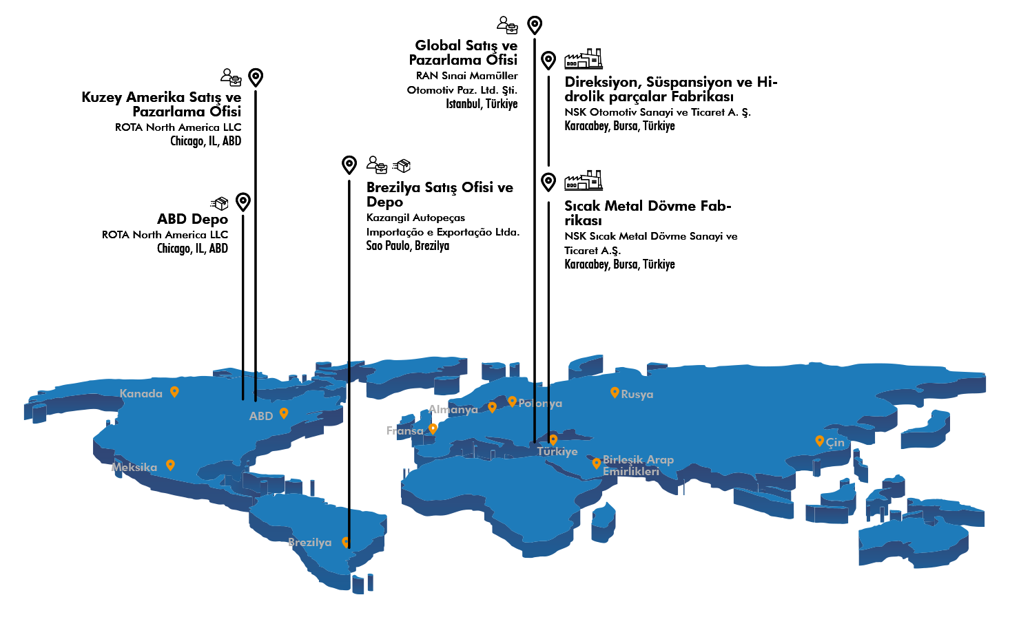 ROTA markası ile ticari araçlar, zirai araçlar, iş makinaları ve diğer bazı sektörler için direksiyon, süspansiyon, hidrolik ve dövme parçaların üretimini yapıyoruz. Bursa'da (Türkiye) iki fabrikamız, İstanbul (Türkiye), Chicago (ABD) satış ve pazarlama ofislerimiz ve São Paulo (Brezilya) ile Chicago (ABD) depolarımız bulunmaktadır. Tüm dünyada müşteri odaklı, pazar lideri ve ilk akla gelen küresel bir marka olma vizyonu ile faaliyet göstermekteyiz.